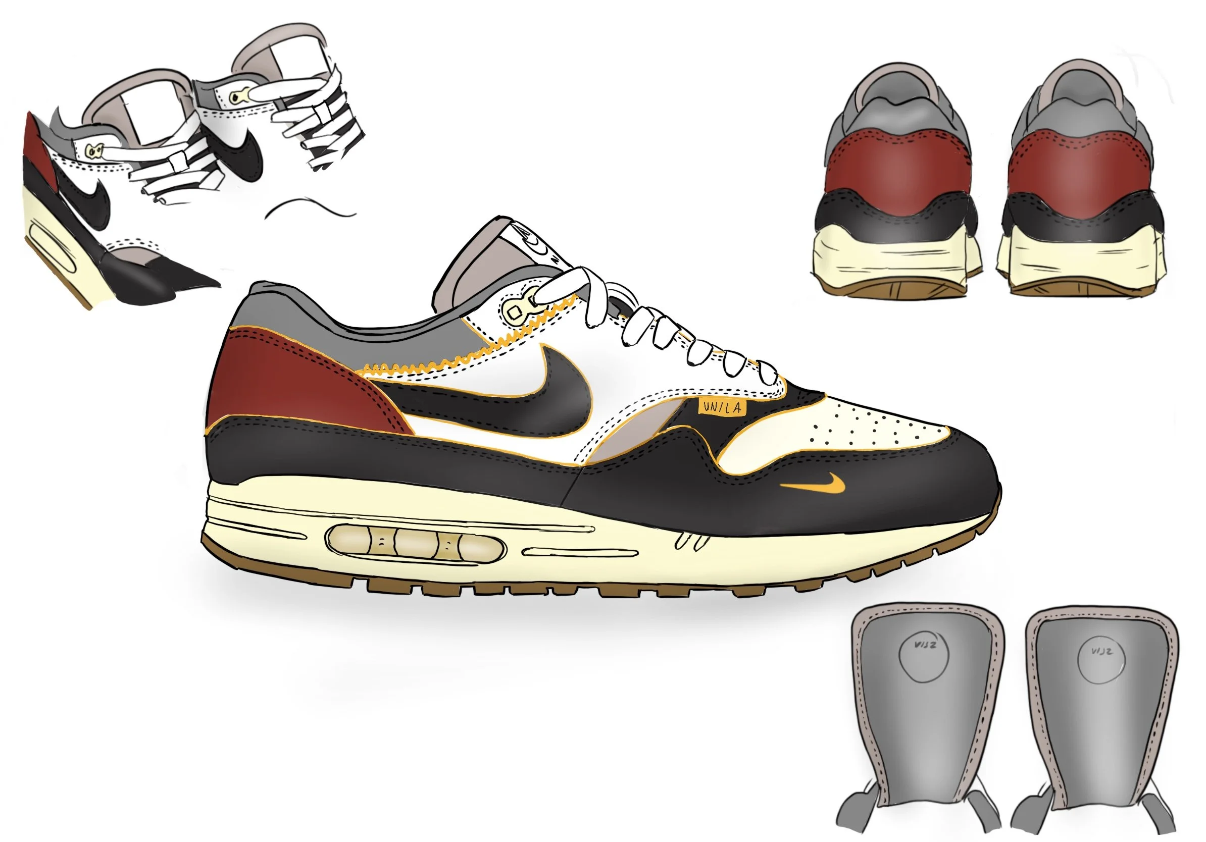 The insoles of the Jordan 1 version has a couple of drawings and notes on it, so I recreated this with drawings of an Air Max 1 and VIJZ references. It’s a small detail but in my opinion that’s what really makes a sneaker pop.
